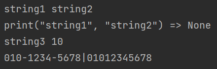 print('010', '1234', '5678', sep='-', end='|') # sep='' : 각각의 값 사이에 -를 넣는다.