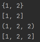 c = set(b); print(c) # 집합은 중복을 허락하지 않으므로 {1, 2}로 출력된다.(원본 데이터의 유실)